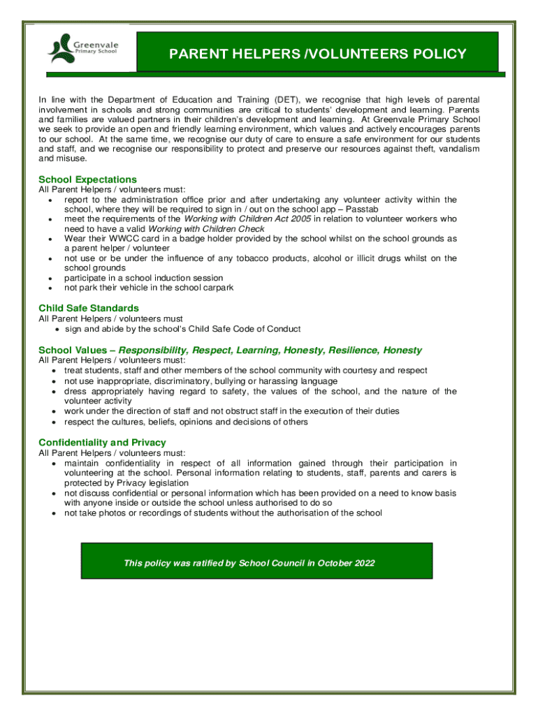 Get the free Parent Helpers / Volunteers Policy - greenvaleps vic edu