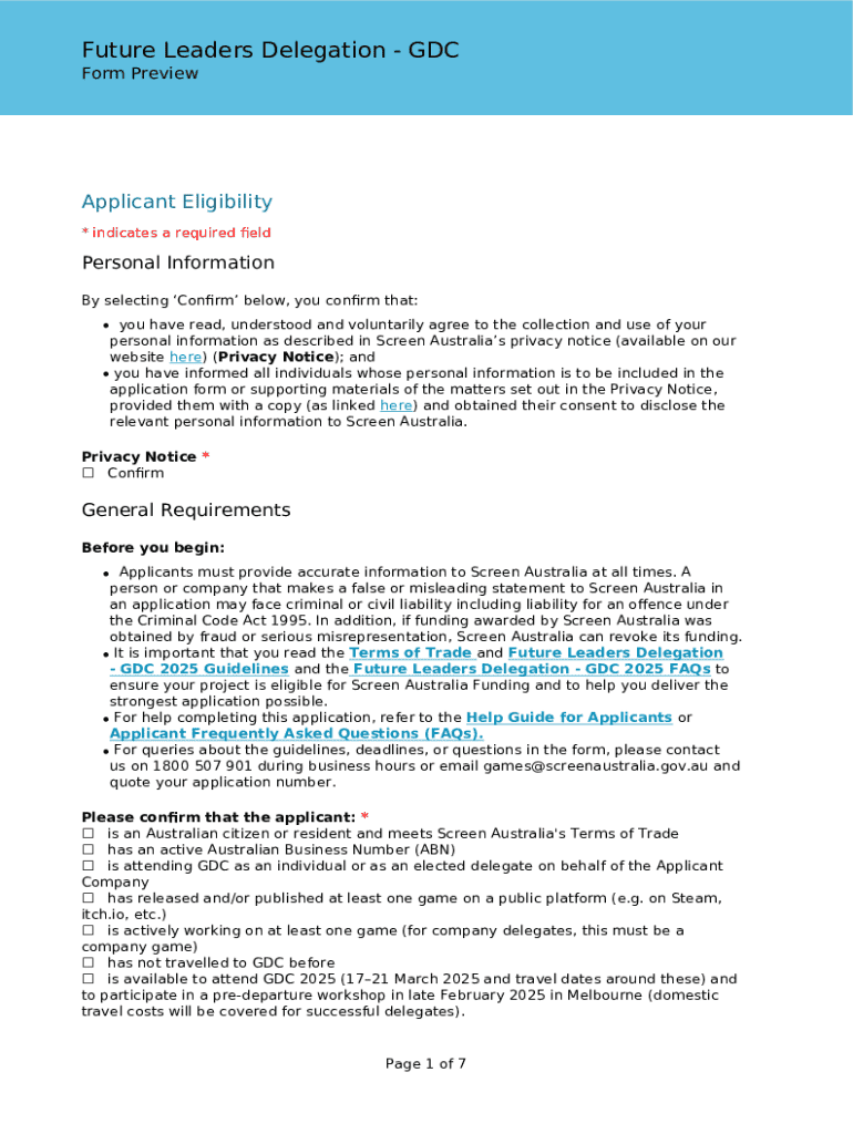 Future Leaders Delegation GDC Form PreviewApplicant Eligibility * indicates a required eldPersonal Information By selecting Conrm below, you conrm that: you have read, understood and voluntarily agree