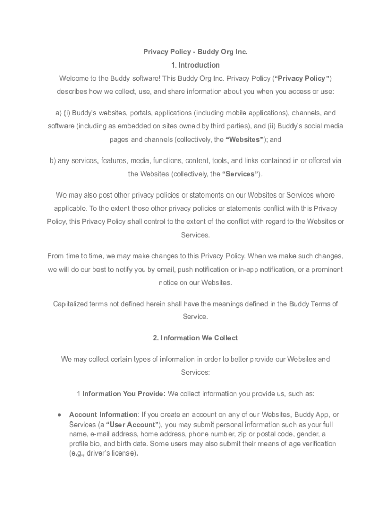 Privacy Policy Buddy Org Inc. 1. Introduction Welcome to the Buddy software! This Buddy Org Inc. Privacy Policy (Privacy Policy) describes how we collect, use, and share information about you when