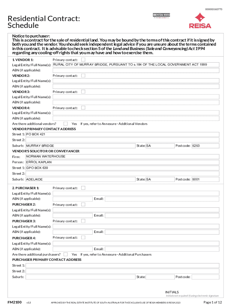This document outlines the terms and conditions related to the sale of residential land, including the rights and obligations of both the vendor and the purchaser. It covers details about vendors, purchasers, property specifics, purchase price, GST implications, settlement date, and various conditions pertaining to chattels, tenancies, and legal regulations. It emphasizes the importance of independent legal advice and highlights potential risks associated with the purchase.