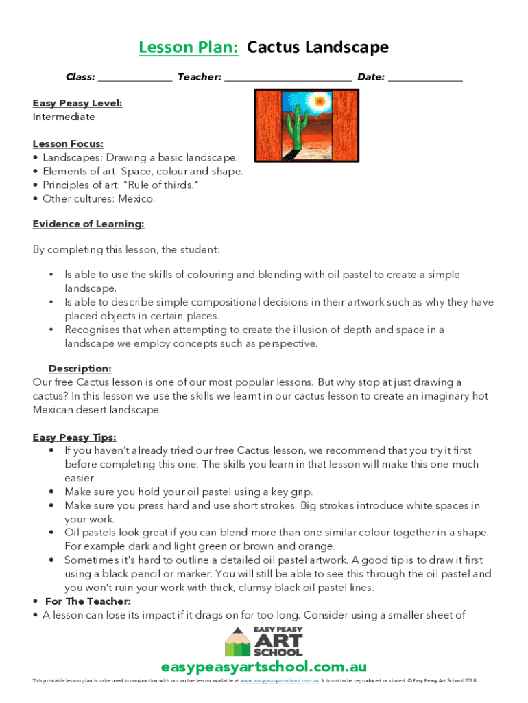 Lesson Plan: Cactus Landscape Class: ___ Teacher: ___ Date: ___ Easy Peasy Level: Intermediate Lesson Focus: Landscapes: Drawing a basic landscape. Elements of art: Space, colour and shape. Principles