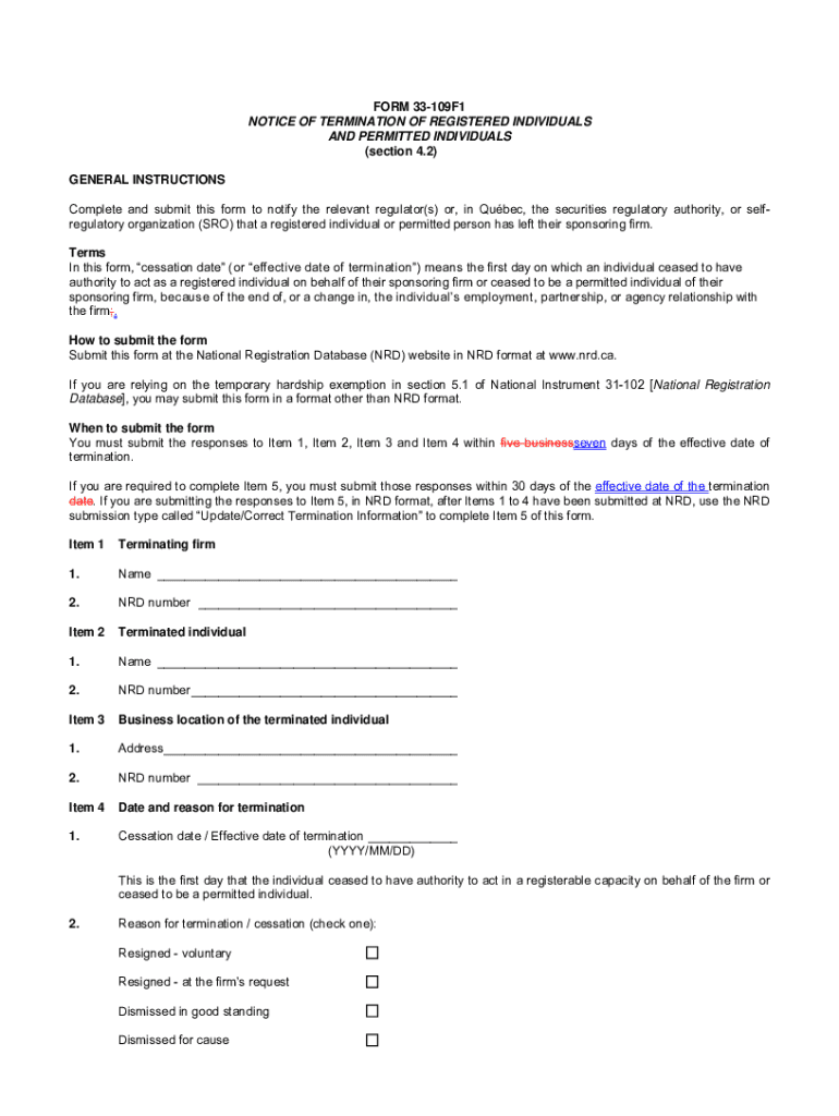 FORM 33109F1 NOTICE OF TERMINATION OF REGISTERED INDIVIDUALS AND PERMITTED INDIVIDUALS (section 4.2) GENERAL INSTRUCTIONS Complete and submit this form to notify the relevant regulator(s) or, in Qubec,