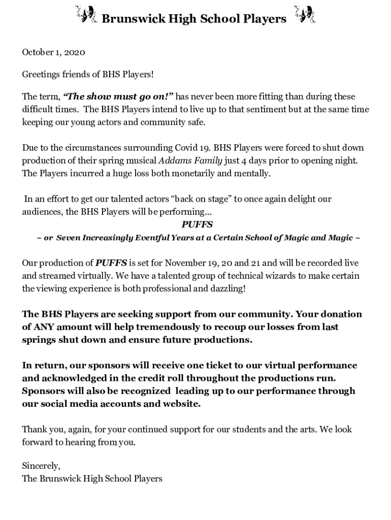 This document serves as a donation form for the Brunswick High School Players\' upcoming virtual performance of PUFFS, aimed at recovering losses from previous productions due to COVID-19. Community support is encouraged to ensure the continuation of the arts within the school.