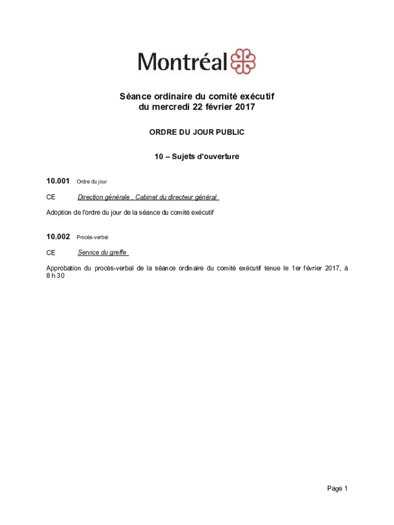 Sance ordinaire du comit excutif du mercredi 22 fvrier 2017 ORDRE DU JOUR PUBLIC 10 Sujets d\'ouverture 10.001Ordre du jourCEDirection gnrale , Cabinet du directeur gnralAdoption de l\'ordre du jour