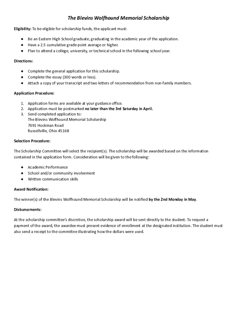 The Blevins Wolfhound Memorial Scholarship Eligibility: To be eligible for scholarship funds, the applicant must: Be an Eastern High School graduate, graduating in the academic year of the application.