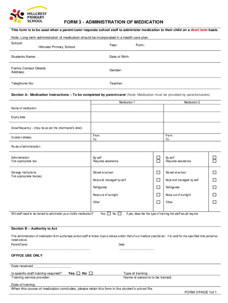 This form is used by parents or carers to request school staff to administer medication to their child on a short-term basis. It includes sections for medication instructions, authority to act, and training requirements for staff if necessary.
