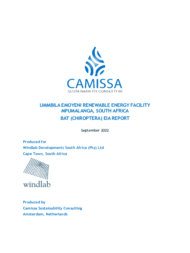 This document presents the Environmental Impact Assessment (EIA) for the Ummbila Emoyeni Renewable Energy Facility, focusing on the potential impacts on bat species due to the development of both wind and solar energy infrastructure in Mpumalanga, South Africa. It includes specialist findings, legal requirements, assessment methodologies, impact assessments, and recommendations for mitigation and monitoring.