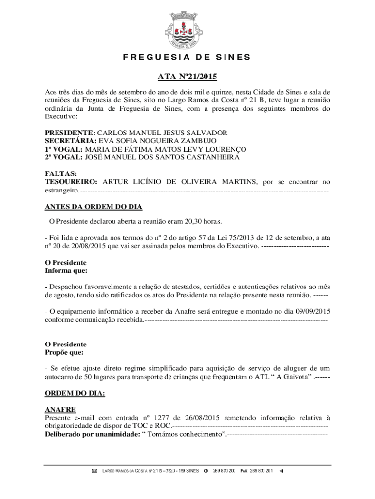 FREGUESIA DE SINES ATA N21/2015 Aos trs dias do ms de setembro do ano de dois mil e quinze, nesta Cidade de Sines e sala de reunies da Freguesia de Sines, sito no Largo Ramos da Costa n 21 B, teve
