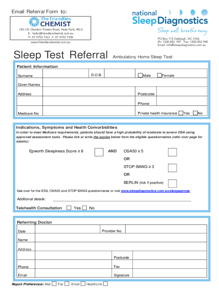 This form is designed for referring patients for a home sleep test, including the assessment of symptoms and comorbidities related to obstructive sleep apnea. It includes sections for patient information, indications for referral based on questionnaire scores, and contact details for the referring doctor.