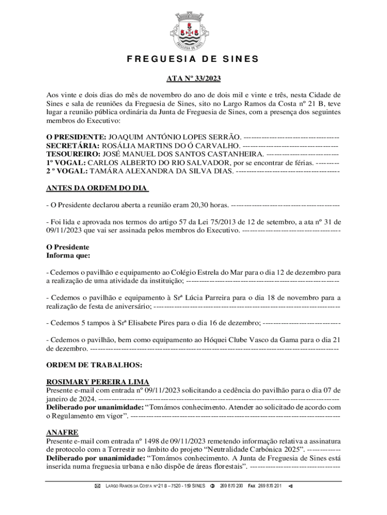 FREGUESIA DE SINES ATA N 33/2023 Aos vinte e dois dias do ms de novembro do ano de dois mil e vinte e trs, nesta Cidade de Sines e sala de reunies da Freguesia de Sines, sito no Largo Ramos da Costa