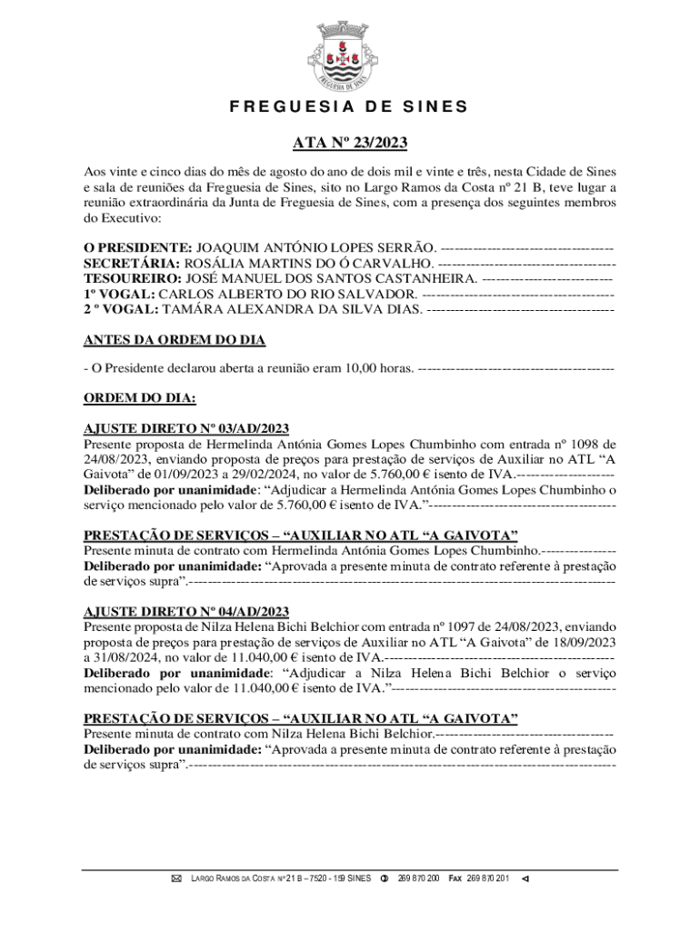 FREGUESIA DE SINES ATA N 23/2023 Aos vinte e cinco dias do ms de agosto do ano de dois mil e vinte e trs, nesta Cidade de Sines e sala de reunies da Freguesia de Sines, sito no Largo Ramos da Costa