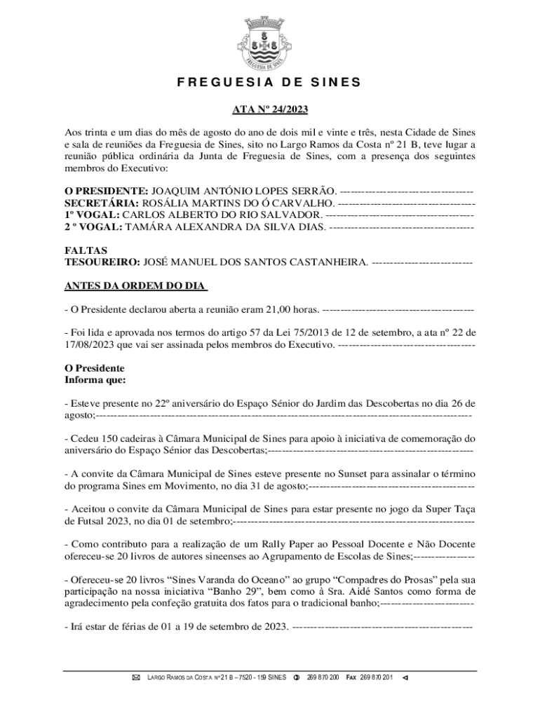 FREGUESIA DE SINES ATA N 24/2023 Aos trinta e um dias do ms de agosto do ano de dois mil e vinte e trs, nesta Cidade de Sines e sala de reunies da Freguesia de Sines, sito no Largo Ramos da Costa