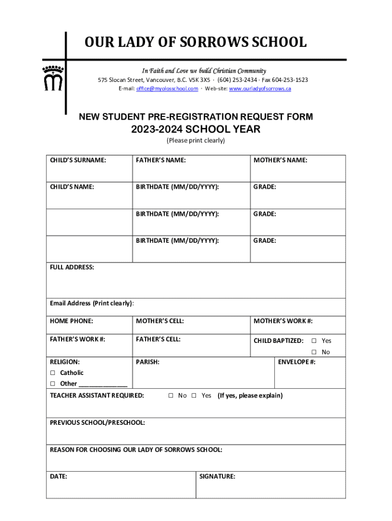 This form is intended for new students wishing to enroll at Our Lady of Sorrows School for the 2023-2024 school year. It collects essential information about the student and their family, including names, contact information, religion, and previous schooling.