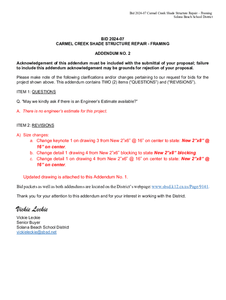 This document serves as Addendum No. 2 for the Bid 2024-07 project, detailing necessary clarifications and revisions regarding the Carmel Creek Shade Structure Repair project by the Solana Beach School District. It includes answers to questions about the project\'s engineer\'s estimate and changes to construction specifications.