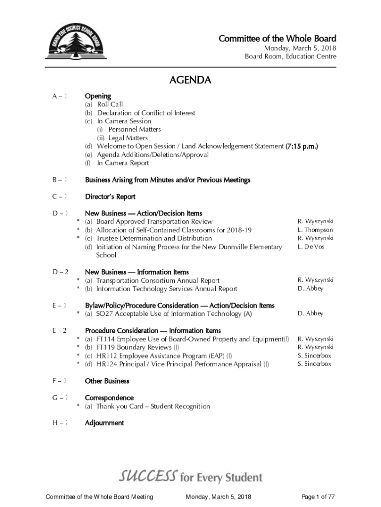 Committee of the Whole Board Monday, March 5, 2018 Board Room, Education CentreAGENDA A1Opening (a) Roll Call (b) Declaration of Conflict of Interest (c) In Camera Session (i) Personnel Matters (ii)