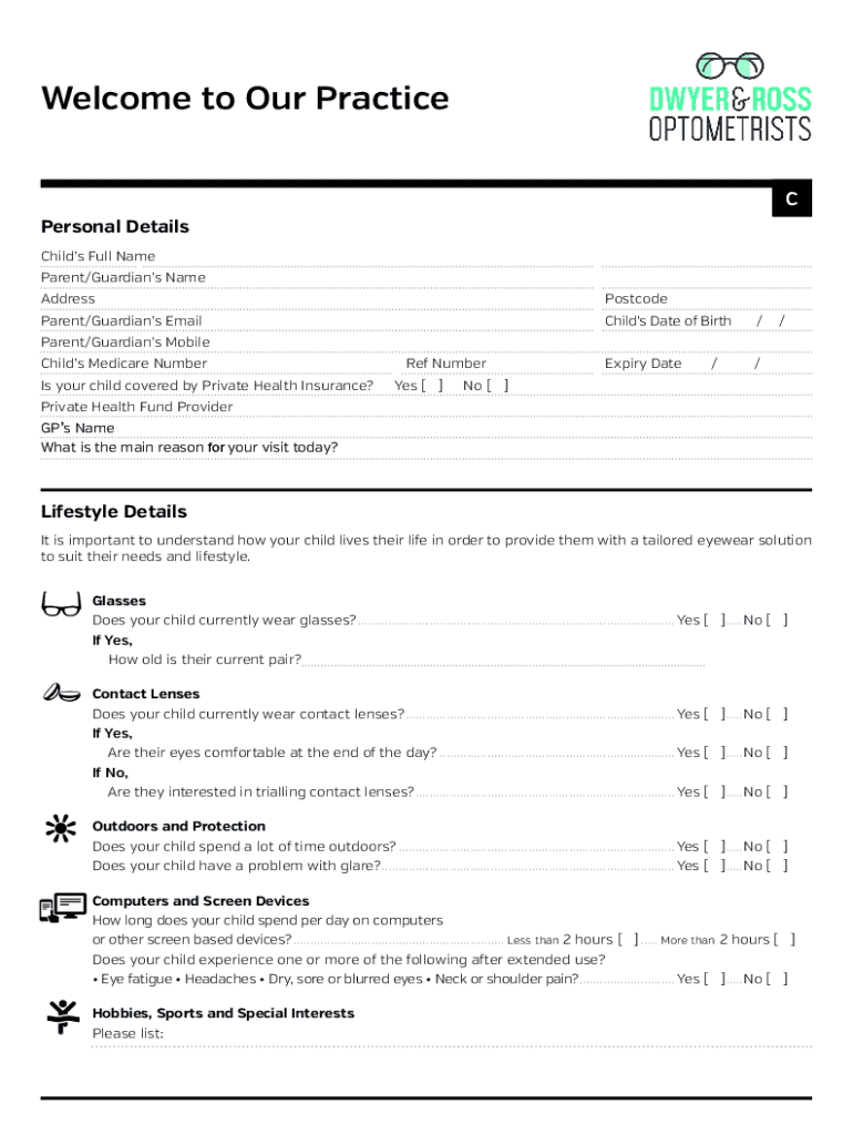 Welcome to Our Practice C Personal Details Childs Full NameParent/Guardians NameAddressPostcodeParent/Guardians EmailChilds Date of Birth/Expiry Date//Parent/Guardians Mobile Childs Medicare Number