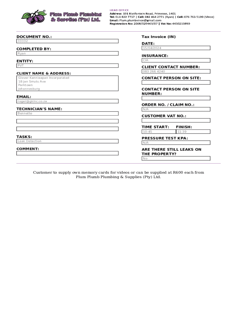 DOCUMENT NO.: 33332Tax Invoice (IN) DATE:COMPLETED BY: Ryan15/04/2024INSURANCE:ENTITY: PVTCIACLIENT CONTACT NUMBER:CLIENT NAME & ADDRESS: Glover Kannieapan Incorporated 18 Jan Smuts Ave Parktown JohannesburgEMAIL:083