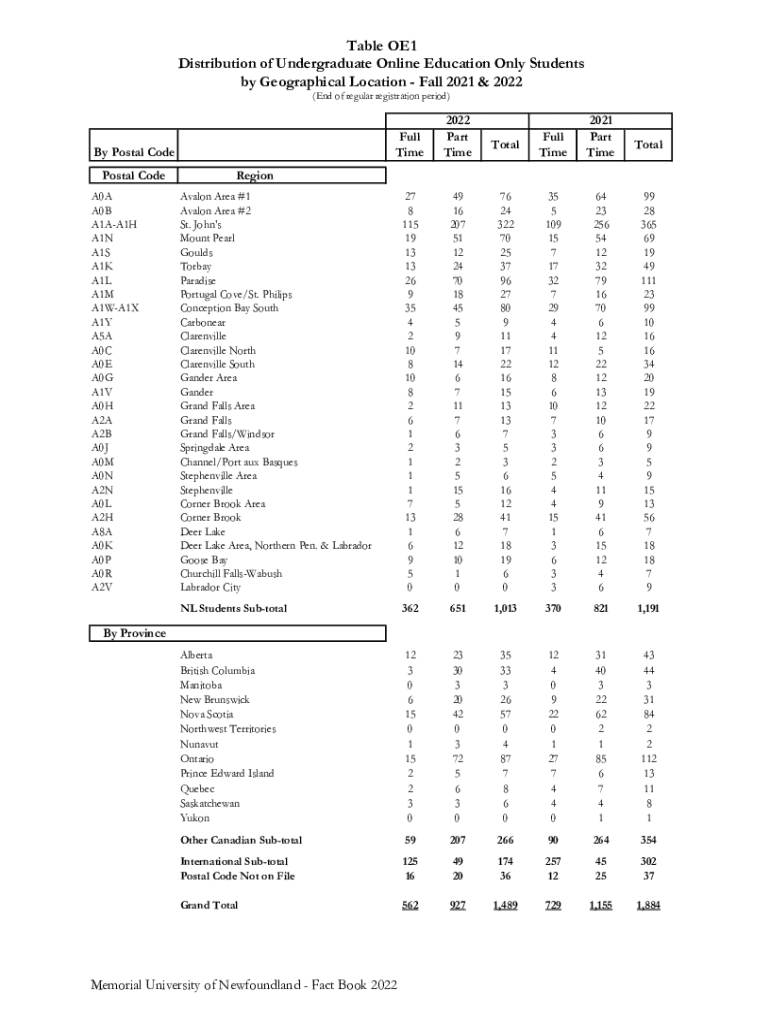This document presents the distribution of undergraduate online education students categorized by geographical location for the Fall semesters of 2021 and 2022, including breakdowns by full-time and part-time statuses.
