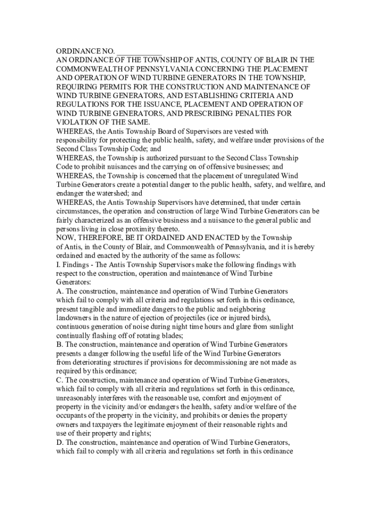 This ordinance outlines the regulations and requirements for the placement, operation, construction, and maintenance of wind turbine generators in Antis Township, Pennsylvania. It aims to protect public health, safety, and welfare by establishing permitting processes, criteria for operation, and penalties for violations. The ordinance addresses concerns regarding noise, safety, aesthetics, environmental impact, and community welfare in relation to wind energy facilities.