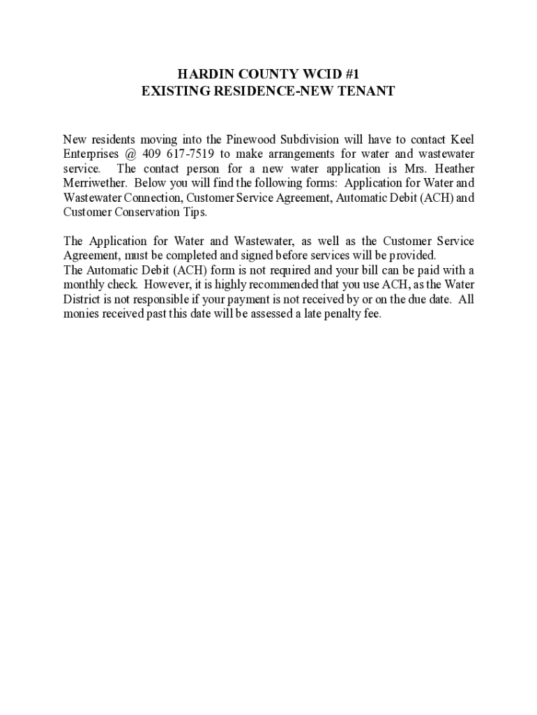 This document provides essential information for new residents in the Pinewood Subdivision regarding the application process for water and wastewater services with Hardin County WCID #1. It includes necessary forms, customer service agreement details, automatic debit authorization, and conservation tips to help manage water usage effectively.