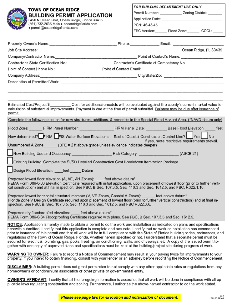 This document serves as a building permit application for the Town of Ocean Ridge. It includes sections for property owner information, contractor details, description of permitted work, and compliance with local, state, and federal regulations, particularly concerning flood zones and building codes.