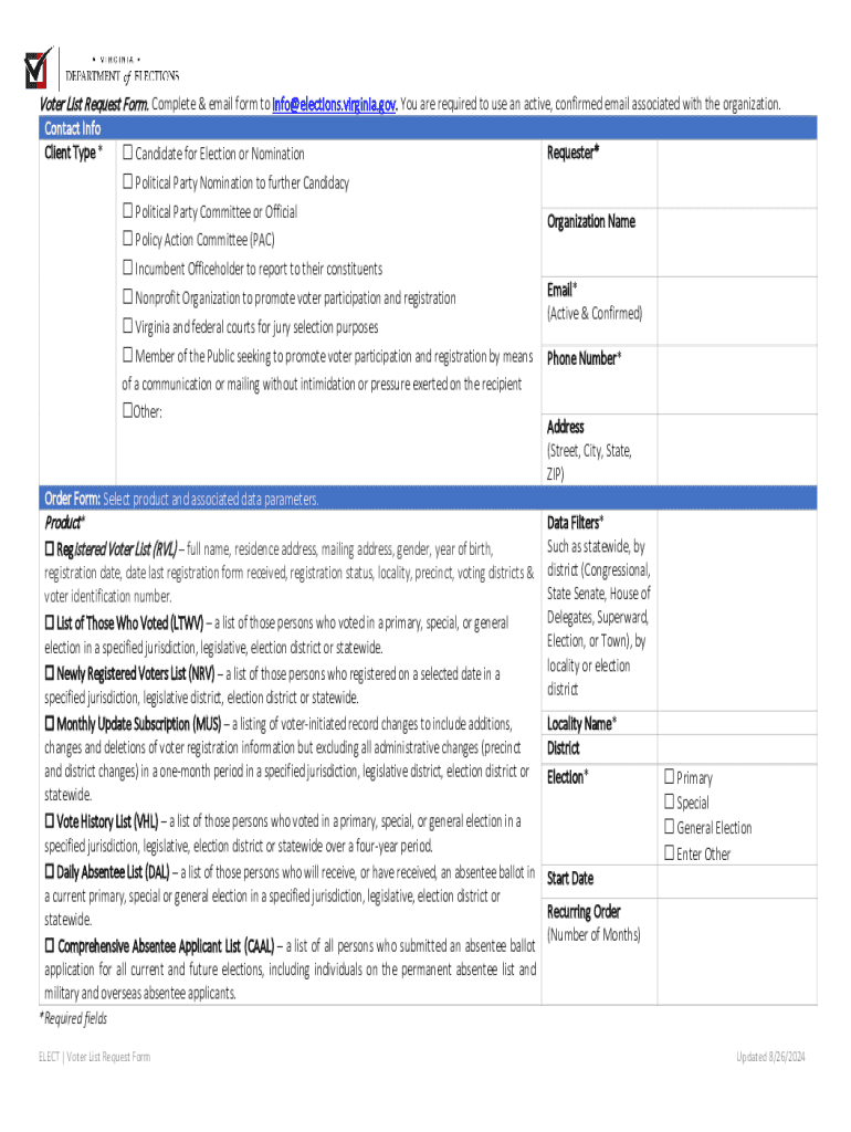 This form is used to request various voter lists from the Virginia elections office, including registered voter lists, lists of those who voted, newly registered voters, and more. It requires an active email and includes fields for organization details and data filters.