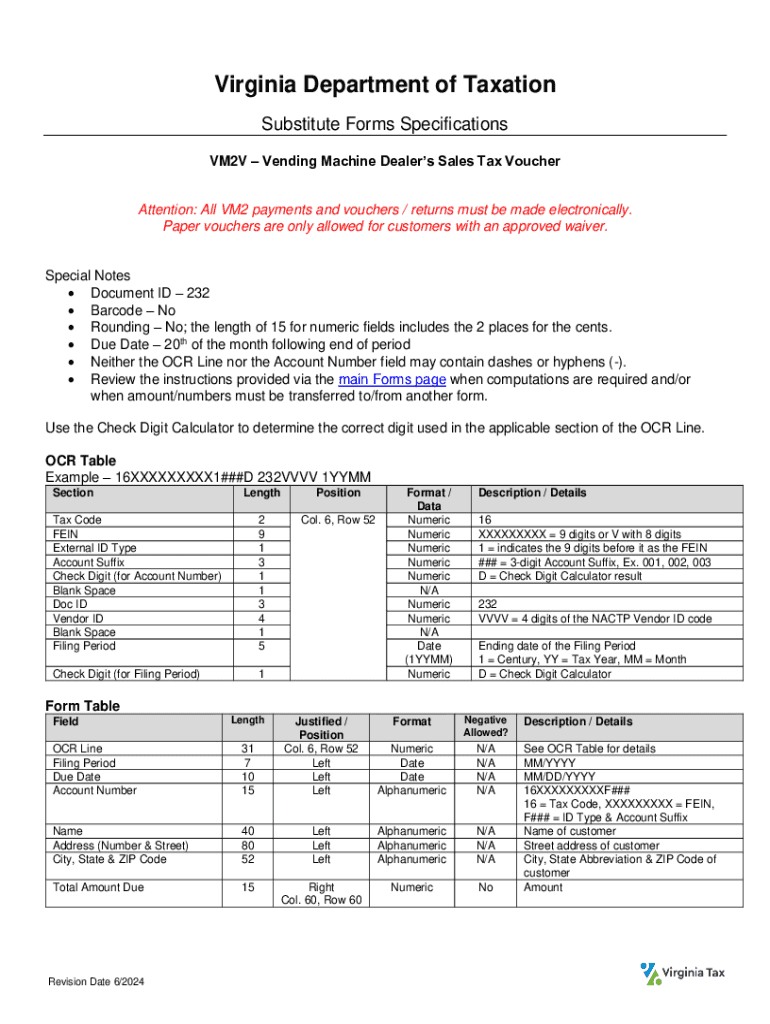 The VM2V is a voucher for Vending Machine Dealers in Virginia, specifying requirements for electronic payments and detailing the necessary format and fields, including tax codes and filing periods. It is essential for compliance with the Virginia Department of Taxation.