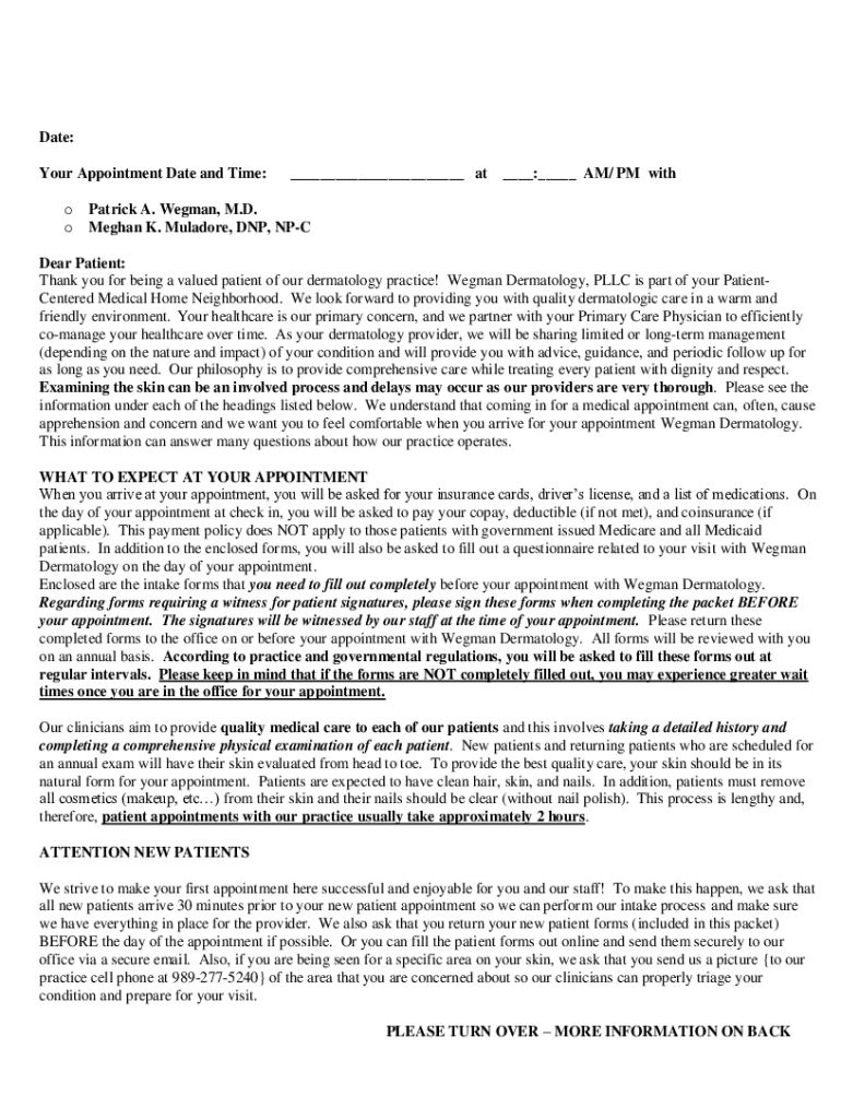 This document provides essential information for patients visiting Wegman Dermatology, including appointment expectations, insurance and payment details, and patient responsibilities to ensure a smooth experience at the clinic.