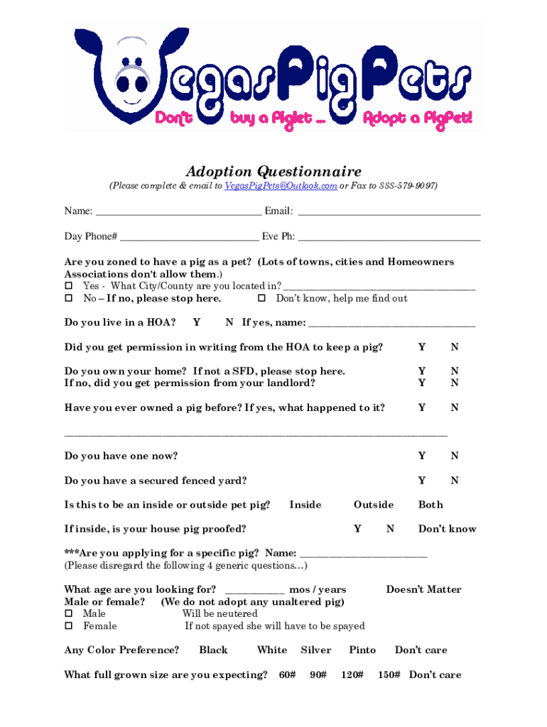 Adoption Questionnaire (Please complete & email to VegasPigPets@Outlook.com or Fax to 8885799097)Name: ___ Email: ___ Day Phone# ___ Eve Ph: ___ Are you zoned to have a pig as a pet? (Lots of towns,
