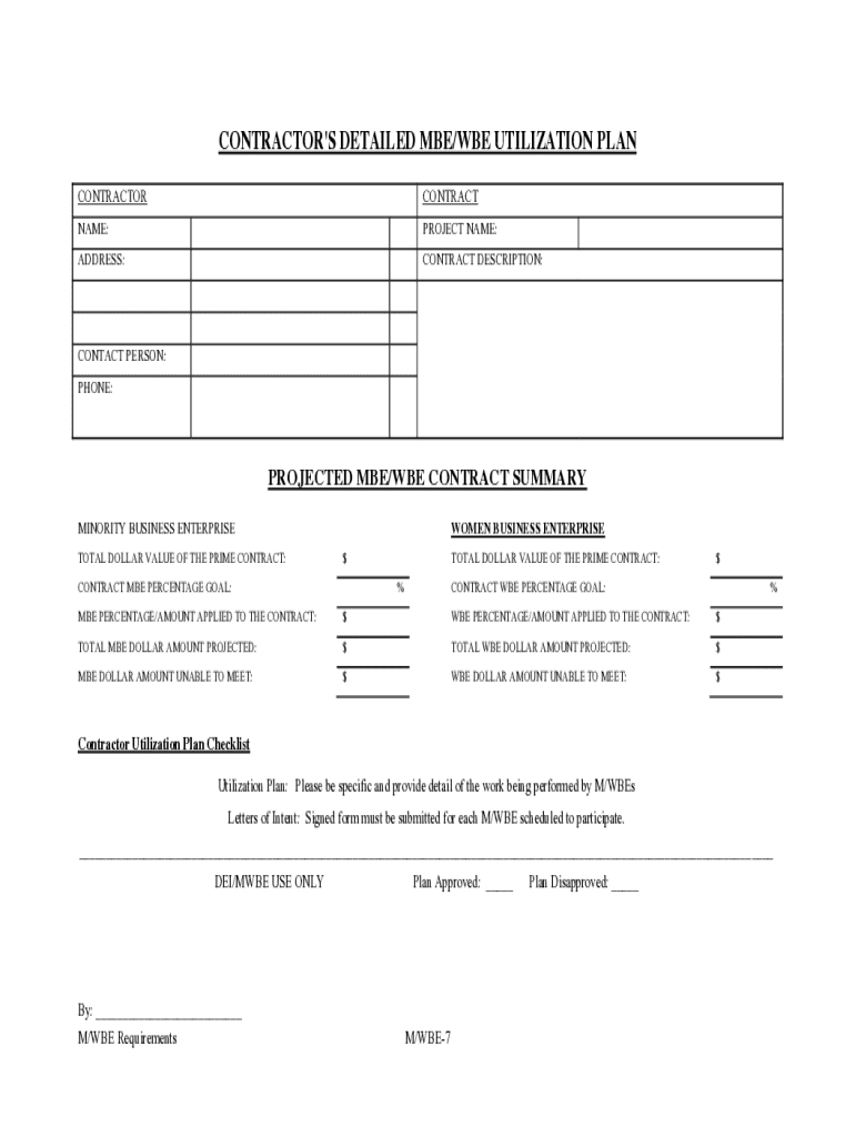 The document outlines the utilization plan for Minority and Women-owned Business Enterprises (M/WBEs) within the Neighborhood Collaborative Project (NCP). It details the involvement of local M/WBEs in various project aspects and emphasizes the intention to engage with these entities despite the absence of a formal M/WBE plan. The document includes sections for contractor information, projected utilization amounts, and a checklist for M/WBE participation.