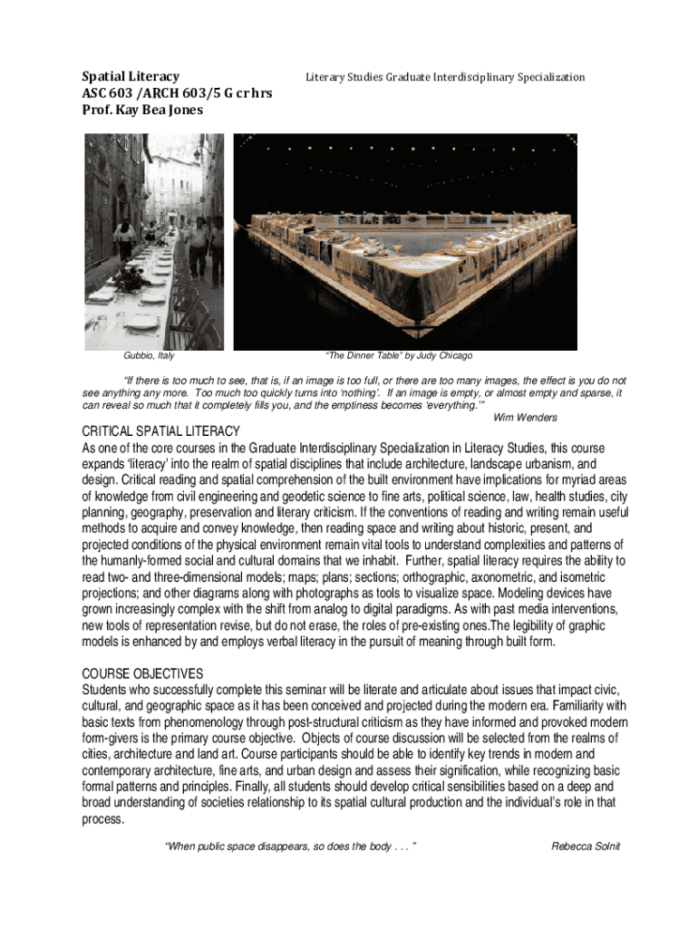 This course expands the concept of literacy into spatial disciplines, incorporating architecture, landscape urbanism, and design. It focuses on the critical reading and comprehension of the built environment, exploring its implications across various fields, including civil engineering, political science, and cultural studies. The course will cover spatial theories, urban practices, and the significance of public spaces, emphasizing the relationship between society and spatial cultural...