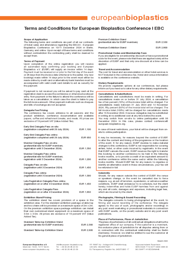 This document outlines the terms and conditions for attendance and ticket sales for the European Bioplastics Conference taking place on December 10-11, 2024, in Berlin, Germany, and online. It covers payment terms, delegate fees, cancellation policies, dietary requirements, and data protection policies. Additionally, it specifies the responsibilities of the participants and the organizing body, European Bioplastics e.V. (EUBP).
