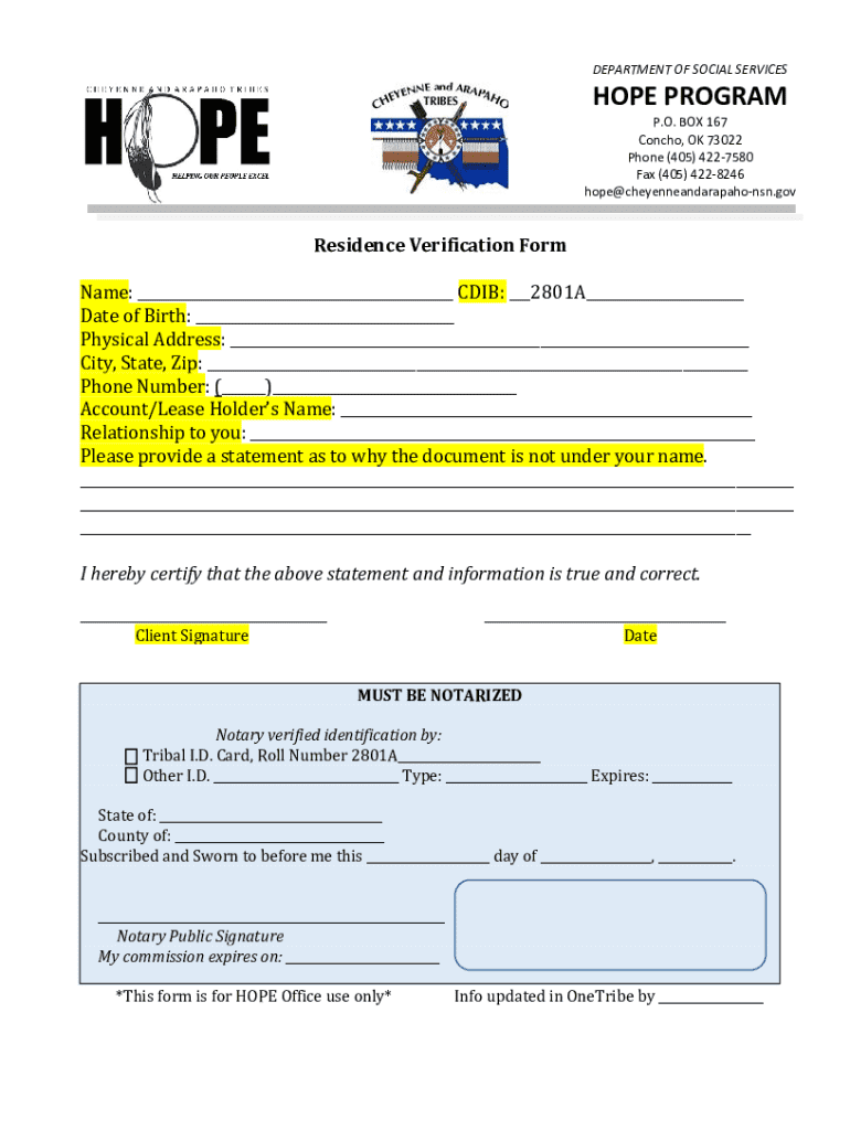 DEPARTMENT OF SOCIAL SERVICESHOPE PROGRAMP.O. BOX 167 Concho, OK 73022 Phone (405) 4227580 Fax (405) 4228246 hope@cheyenneandarapahonsn.govResidence Verification Form Name: ___ CDIB: ___2801A___ Date