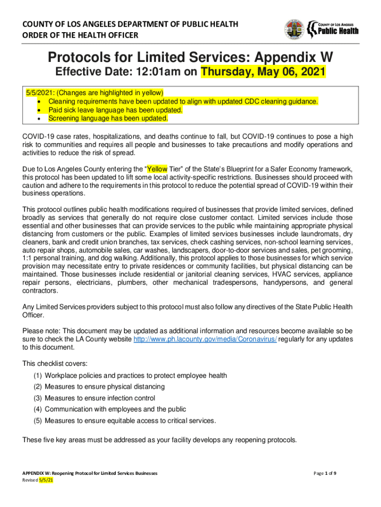 COUNTY OF LOS ANGELES DEPARTMENT OF PUBLIC HEALTH ORDER OF THE HEALTH OFFICERProtocols for Limited Services: Appendix W Effective Date: 12:01am on Thursday, May 06, 2021 5/5/2021: (Changes are highlighted