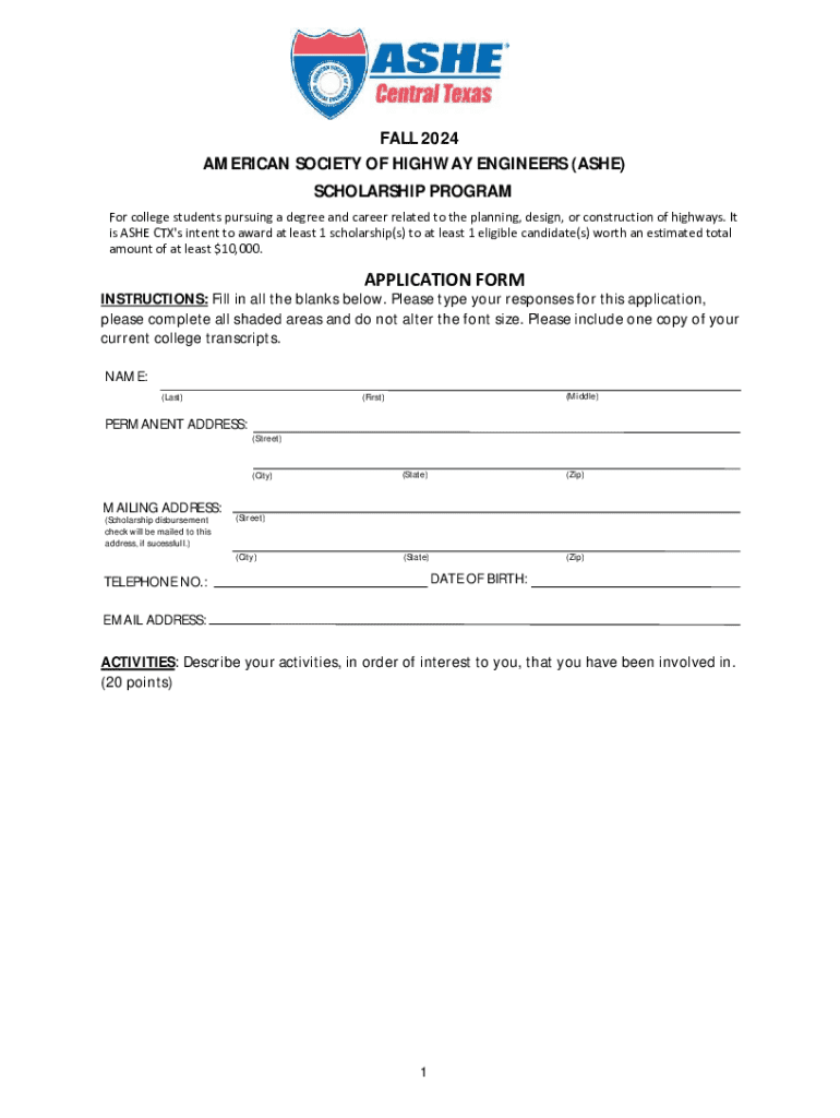 This document is an application form for the Fall 2024 ASHE Scholarship Program, aimed at college students pursuing degrees related to the planning, design, or construction of highways. The program seeks to award scholarships worth at least $10,000 to eligible candidates who fulfill the application criteria and deadlines.