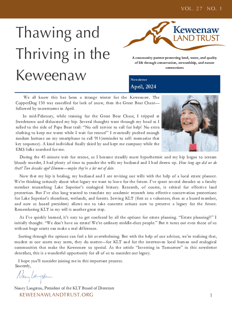 VOL. 27 NO. 1Thawing and Thriving in the KeweenawA community partner protecting land, water, and quality of life through conservation, stewardship, and nature connections NewsletterApril, 2024We all