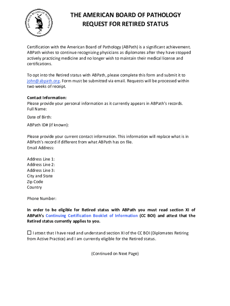 THE AMERICAN BOARD OF PATHOLOGY REQUEST FOR RETIRED STATUS Certification with the American Board of Pathology (ABPath) is a significant achievement. ABPath wishes to continue recognizing physicians
