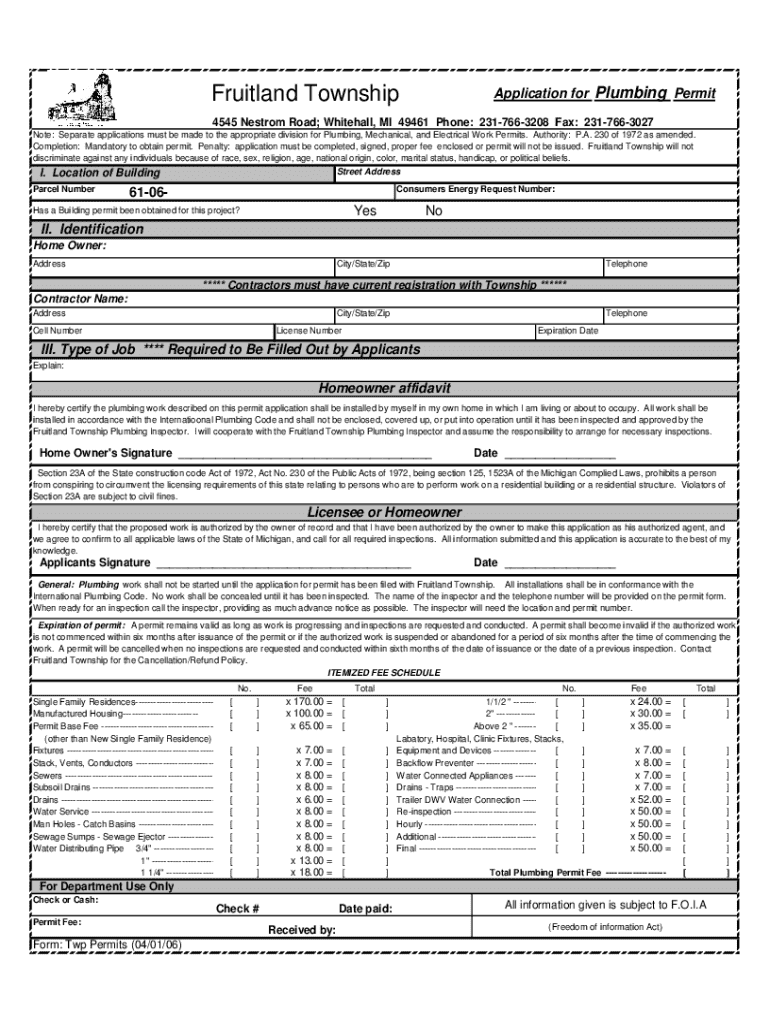 This document is an application form for obtaining a plumbing permit in Fruitland Township. It outlines the requirements for applicants, including necessary signatures, information regarding inspections, and fee schedules for various plumbing services. It also emphasizes compliance with the International Plumbing Code and non-discrimination policies.