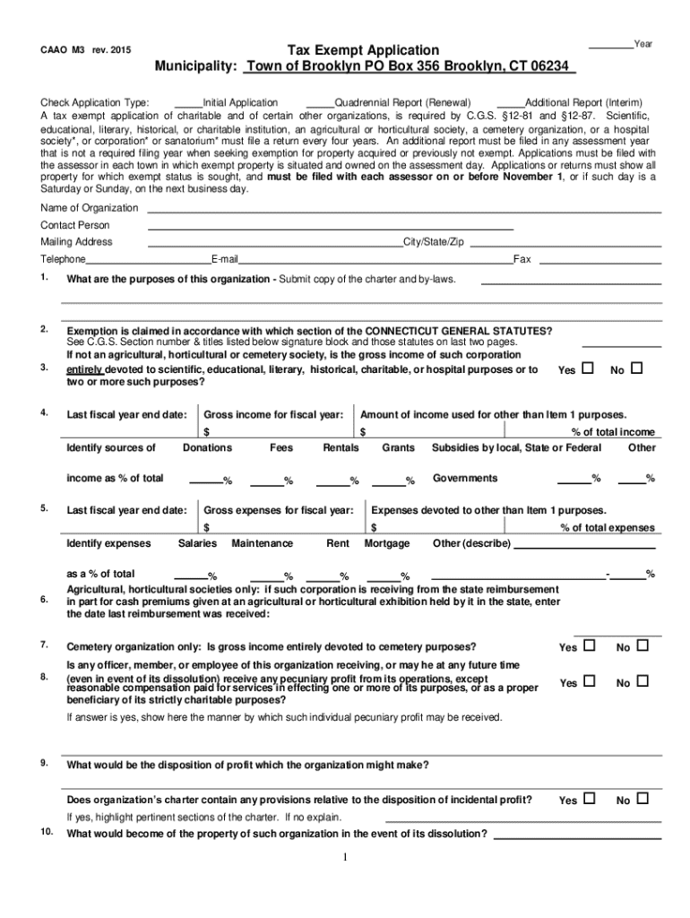 CAAO M3 rev. 2015YearTax Exempt Application Municipality: Town of Brooklyn PO Box 356 Brooklyn, CT 06234Check Application Type: Initial Application Quadrennial Report (Renewal) Additional Report (Interim)