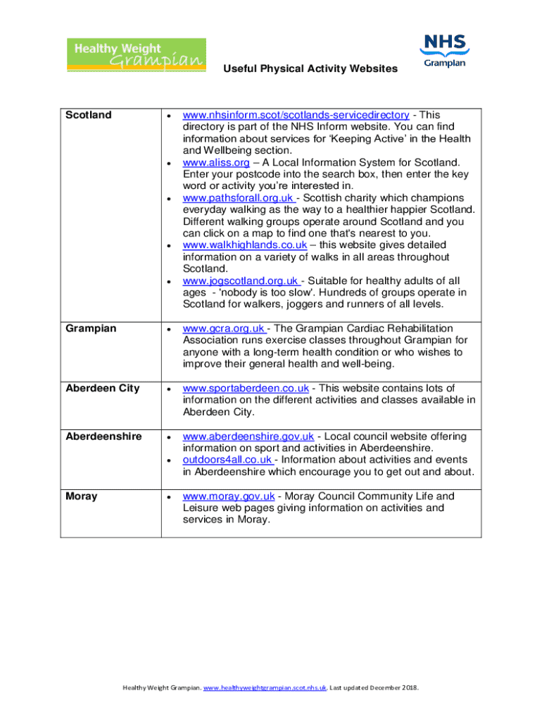 Useful Physical Activity WebsitesScotlandwww.nhsinform.scot/scotlandsservicedirectory This directory is part of the NHS Inform website. You can find information about services for Keeping Active in