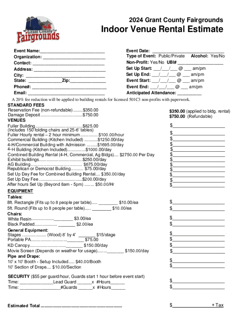 This document provides an estimate for indoor venue rental at the Grant County Fairgrounds. It includes event details, standard fees, available venues, equipment rental, and security requirements. A discount is offered for licensed 501C3 non-profits.