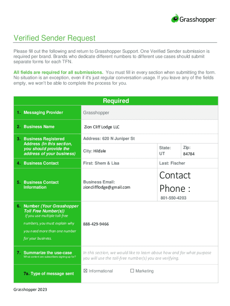 This document is a request form that needs to be filled out by brands seeking to verify their toll-free numbers through Grasshopper Support. It outlines the necessary information required for each brand and the conditions under which multiple submissions may be needed. The form emphasizes that all fields are mandatory and provides details about messaging use cases, consumer opt-in processes, and the need for compliance with messaging guidelines.