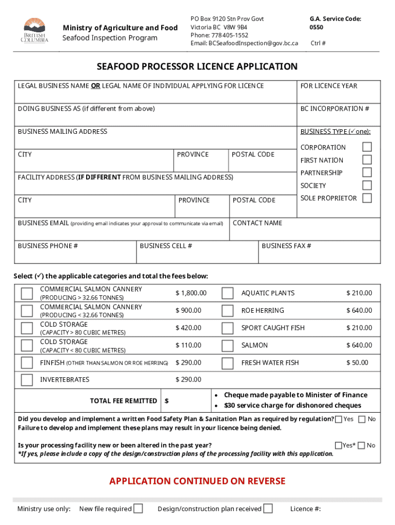 Ministry of Agriculture and Food Seafood Inspection ProgramPO Box 9120 Stn Prov Govt Victoria BC V8W 9B4 Phone: 778 4051552 Email: BCSeafoodInspection@gov.bc.caG.A. Service Code: 0550 Ctrl #SEAFOOD