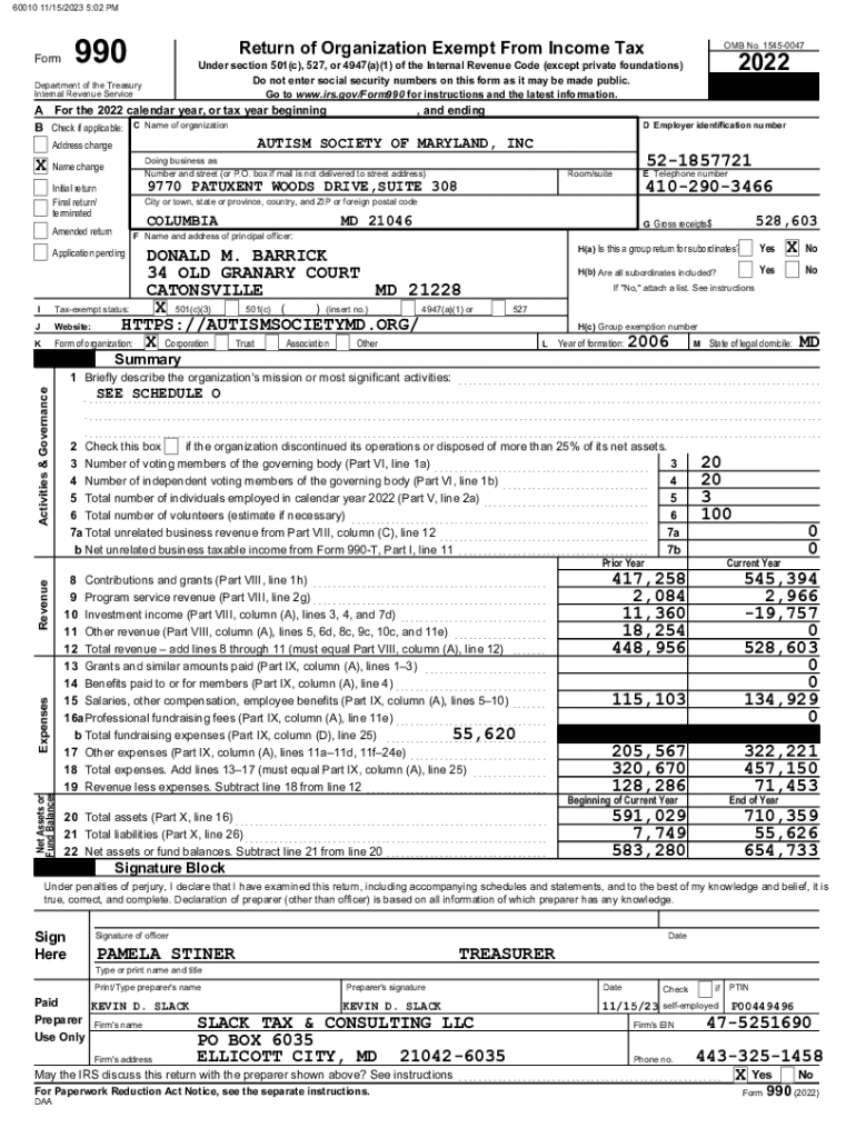 This document is the IRS Form 990 for the Autism Society of Maryland, Inc., detailing the organization\'s financial activities, governance, and compliance with tax-exempt status requirements for the fiscal year ending in 2022. It includes sections on revenue, expenses, and program accomplishments, alongside the organization\'s mission to support families affected by autism.