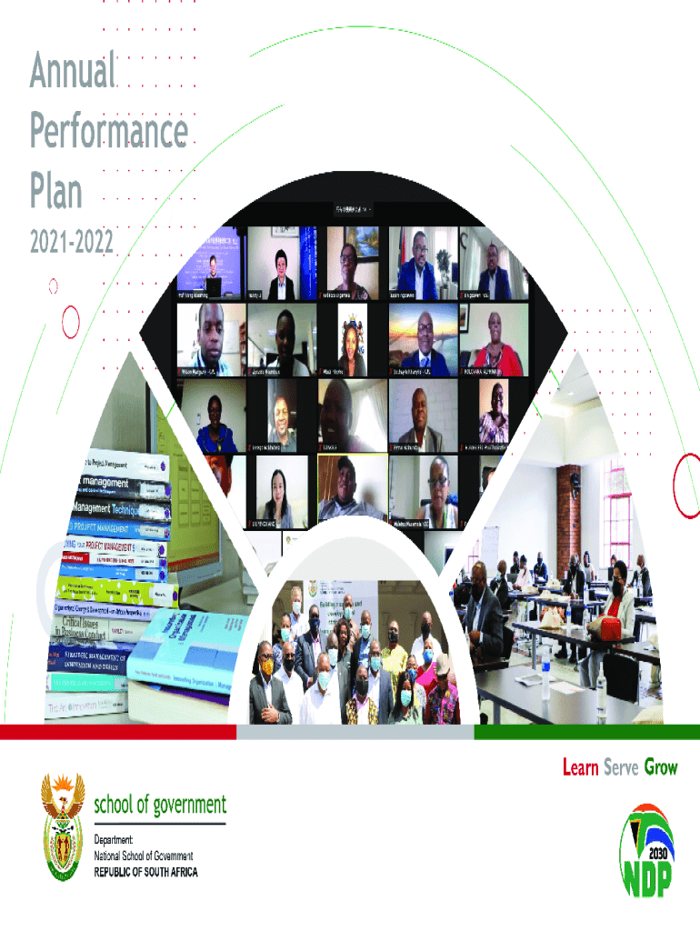 This document outlines the Annual Performance Plan for the National School of Government for the fiscal year 2021/22. It details the strategic focus, performance indicators, budget allocation, and partnerships aimed at enhancing the education, training, and development interventions for public servants in alignment with the goals of a capable, ethical, and developmental state amid the challenges posed by the COVID-19 pandemic.