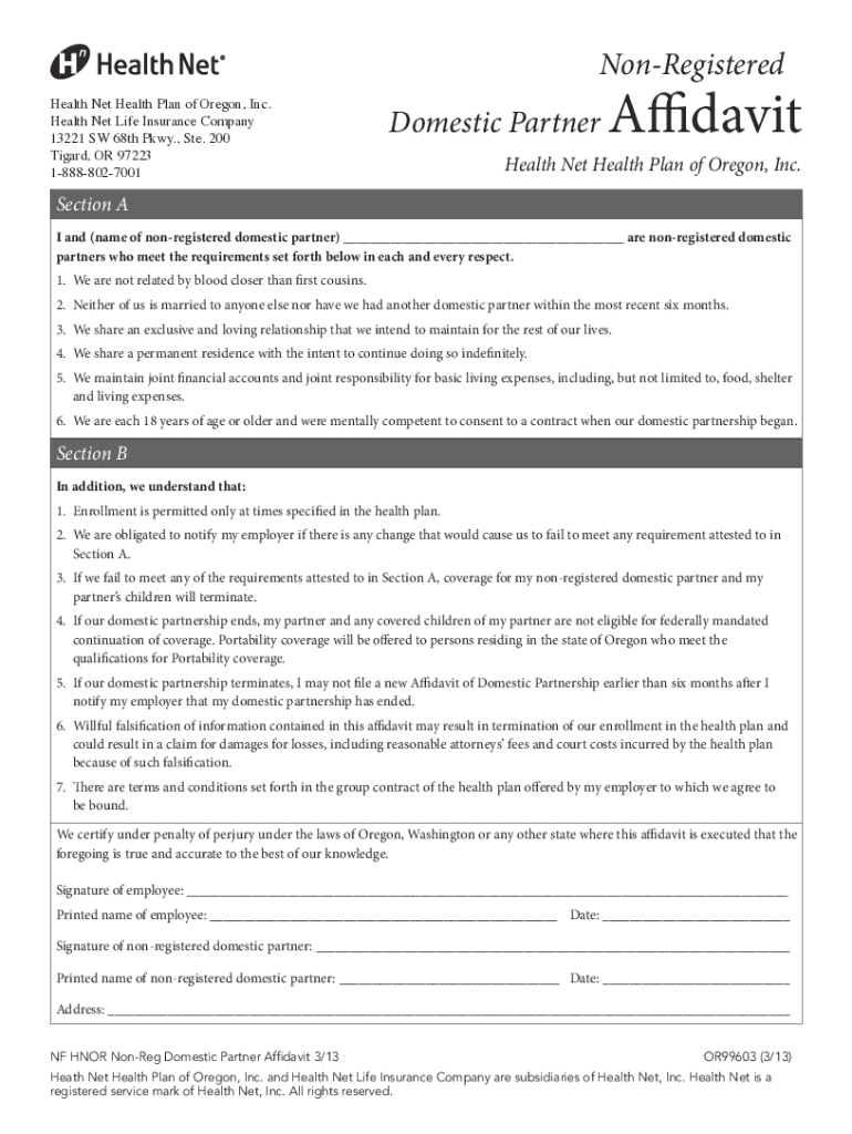 This document serves as an affidavit for non-registered domestic partners who are applying for health plan coverage under Health Net Health Plan of Oregon, Inc. It outlines the requirements and responsibilities of partners, including financial obligations, residency, and conditions for enrollment and termination of coverage.