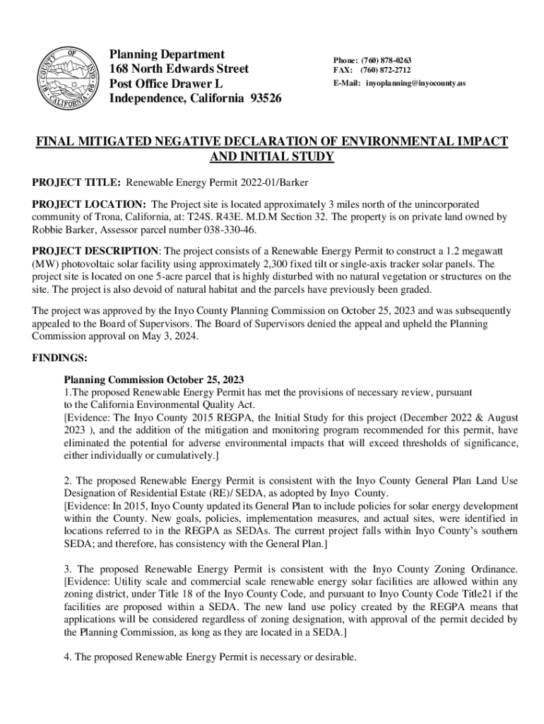 Planning Department 168 North Edwards Street Post Office Drawer L Independence, California 93526Phone: (760) 8780263 FAX: (760) 8722712 EMail: inyoplanning@inyocounty.usFINAL MITIGATED NEGATIVE DECLARATION