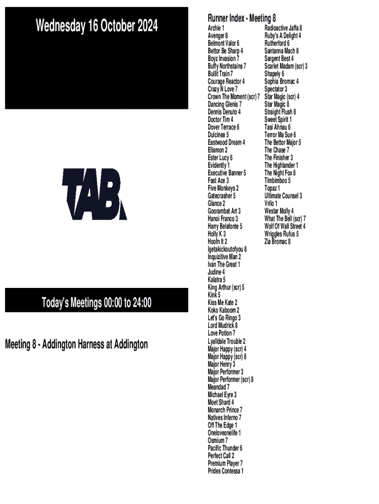 Wednesday 16 October 2024Today\'s Meetings 00:00 to 24:00 Meeting 8 Addington Harness at AddingtonRunner Index Meeting 8 Archie 1 Avenger 8 Belmont Valor 6 Bettor Be Sharp 4 Boyz Invasion 7 Buffy