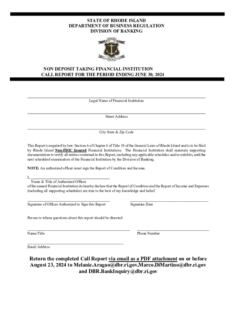 STATE OF RHODE ISLAND DEPARTMENT OF BUSINESS REGULATION DIVISION OF BANKINGNON DEPOSIT TAKING FINANCIAL INSTITUTION CALL REPORT FOR THE PERIOD ENDING JUNE 30, 2024Legal Name of Financial InstitutionStreet