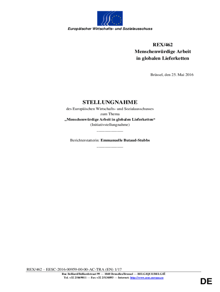Europischer Wirtschafts und SozialausschussREX/462 Menschenwrdige Arbeit in globalen LieferkettenBrssel, den 25. Mai 2016STELLUNGNAHME des Europischen Wirtschafts und Sozialausschusses zum Thema Menschenwrdige